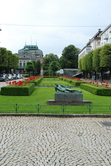 20170824 Views of Bergen Town Centre -- Ovre Ole Bulls Plass and the Lying Poet statue